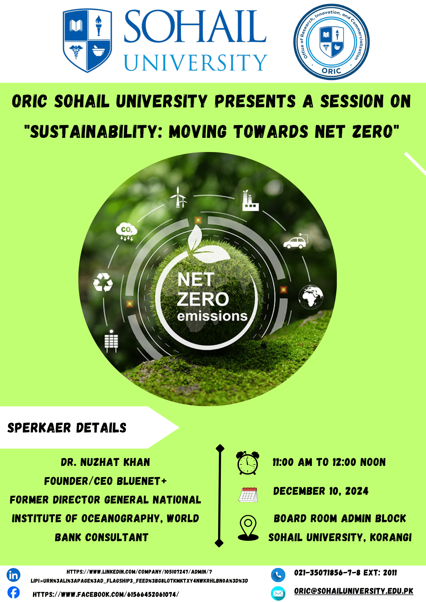 The seminar on “Self-Awareness & Ownership,” organized by ORIC, Sohail University, in collaboration with Heer Association NGO, took place on March 18, 2025, at Shaheed-e-Millat Campus. The session featured Mr. Syed Munawar Ali and Ms. Syeda Noreen as resource persons, who shared valuable insights on personal growth, self-awareness, and taking ownership of one’s actions. The aim of the session was to empower participants with the knowledge and skills necessary for self-improvement and personal development.