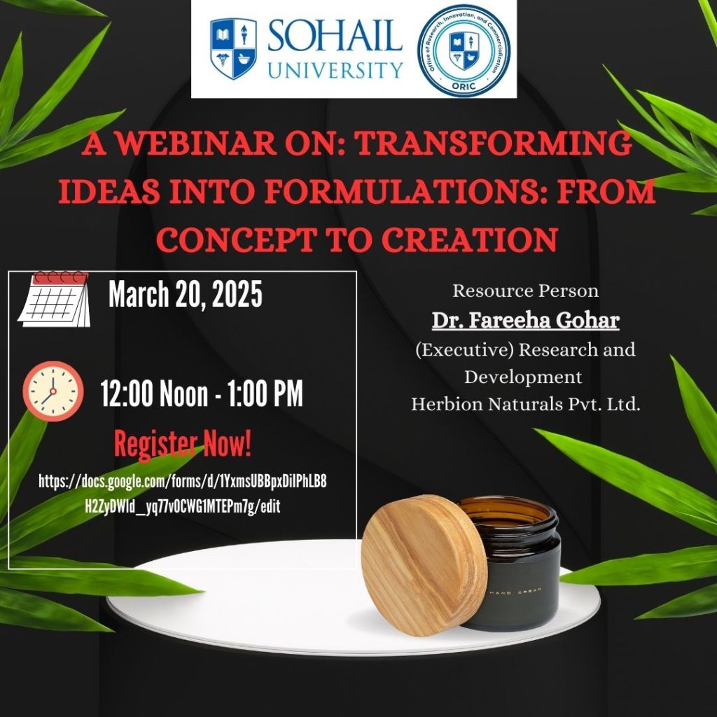 On March 20, 2025, ORIC at Sohail University, in collaboration with Herbion Naturals Pvt. Ltd., hosted a webinar titled “Transforming Ideas into Formulations: From Concept to Creation.”